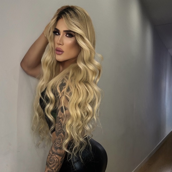 Haare:blond, rückenlang, wellig